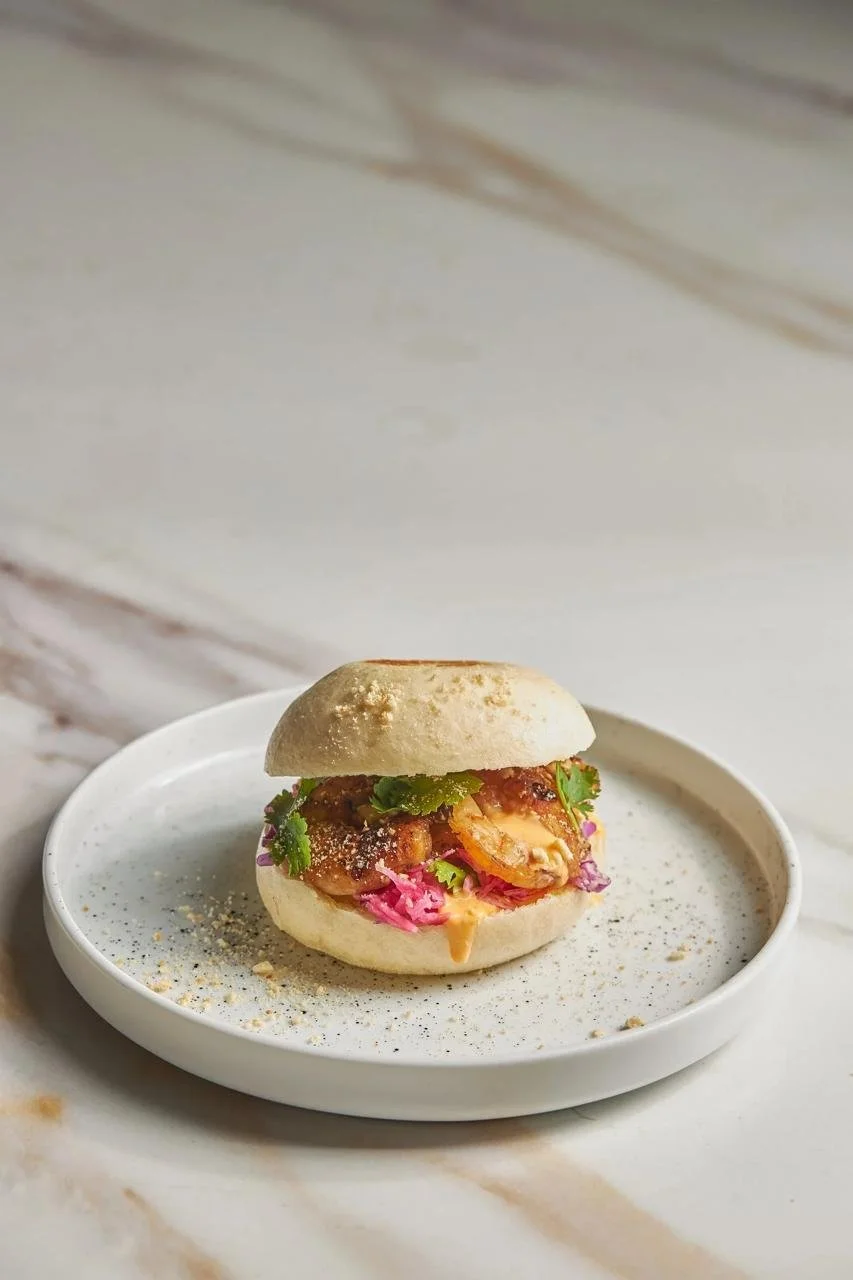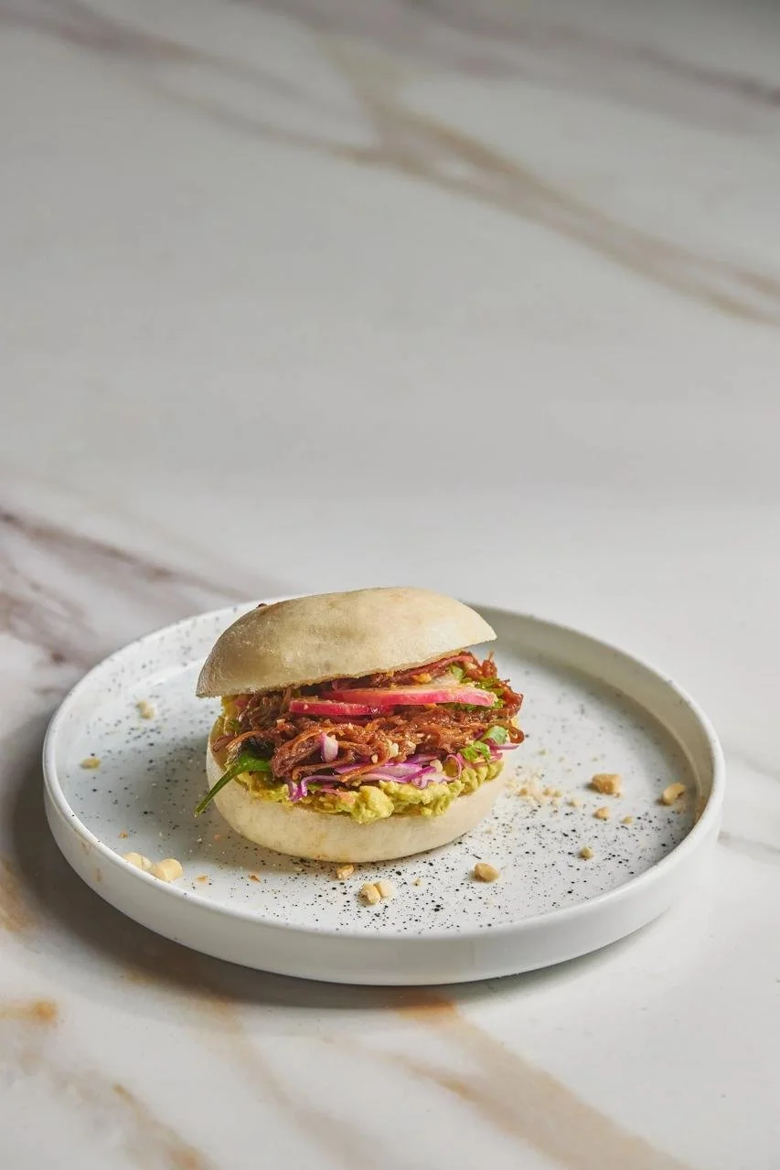 BBQ pulled brisket, served in our homemade steamed bun with guacamole, coriander and salted nuts.