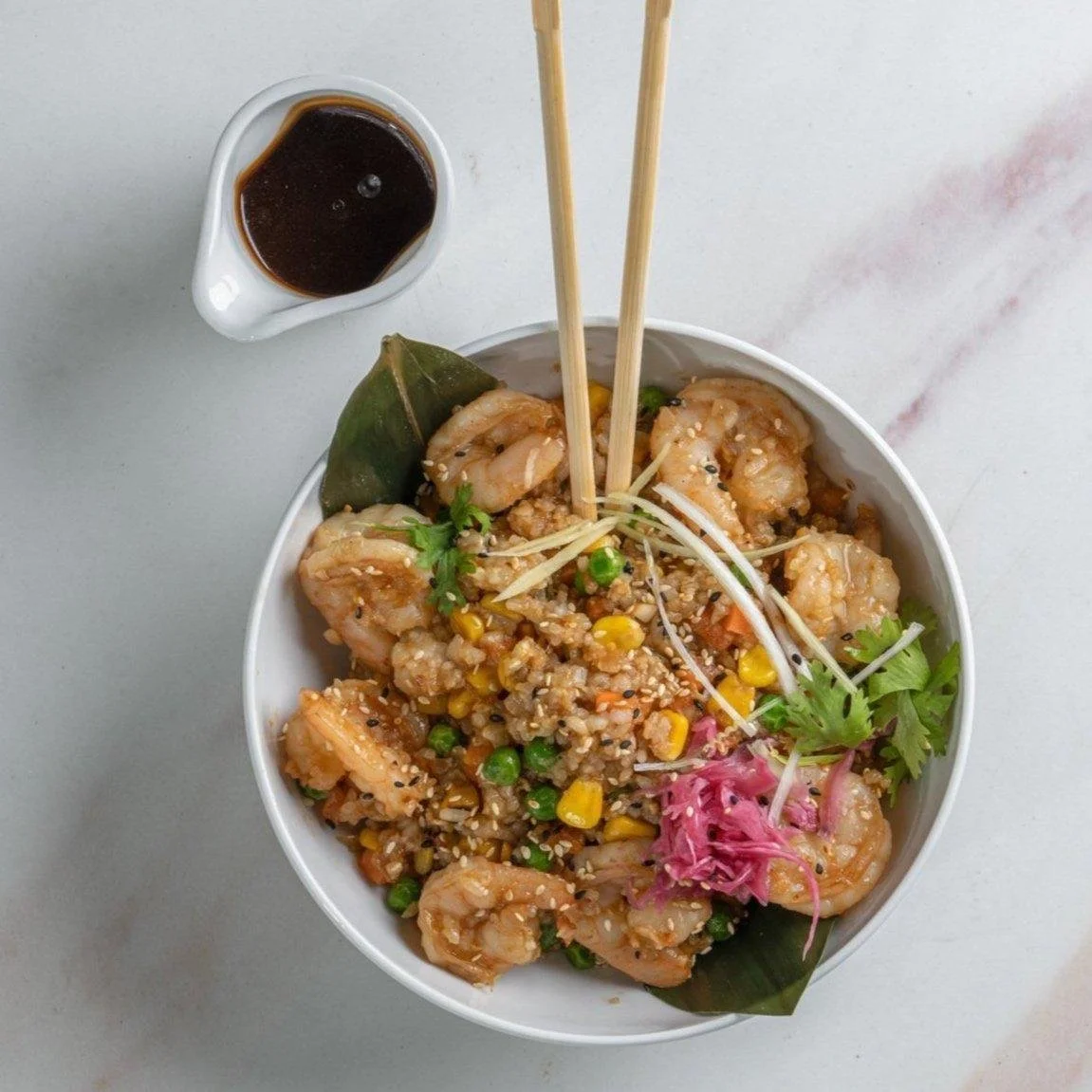 Ginger & garlic fried rice, carrots, corn, peas, spring onion & light soy dressing.