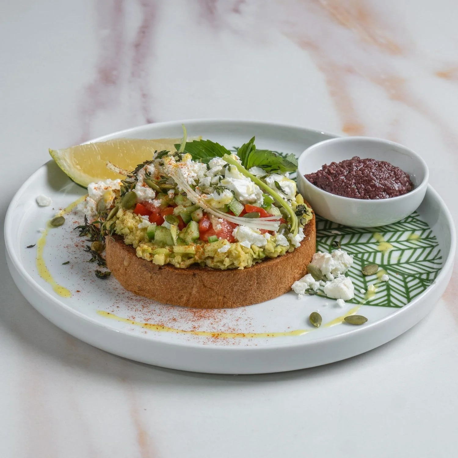Toasted brioche, avocado spread, Greek feta, chopped tomato & cucumber bruschetta, thyme, toasted pumpkin seeds.