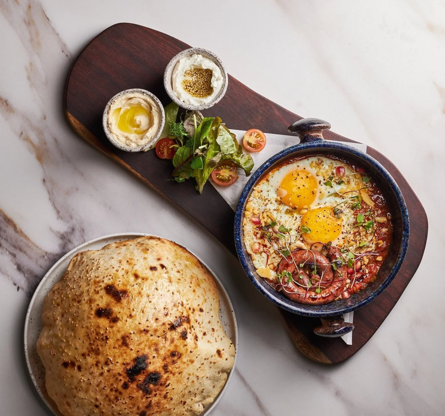Fried Eggs, Arabic Spiced Sausage in Tomato Sauce, Toasted Dukkha,