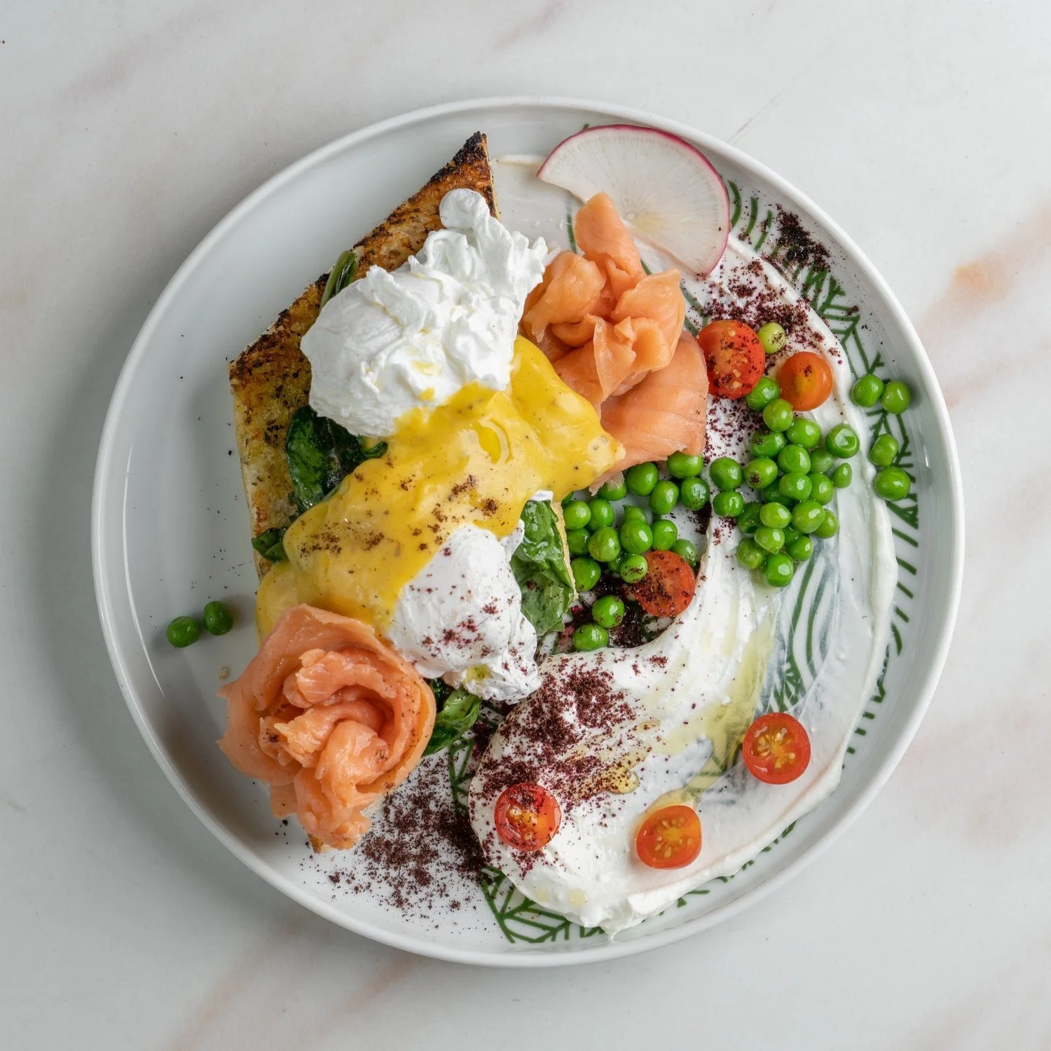 Smoked Salmon, Spinach, Zesty Sumac Labneh, and sautéed Peas, Toasted Bread.