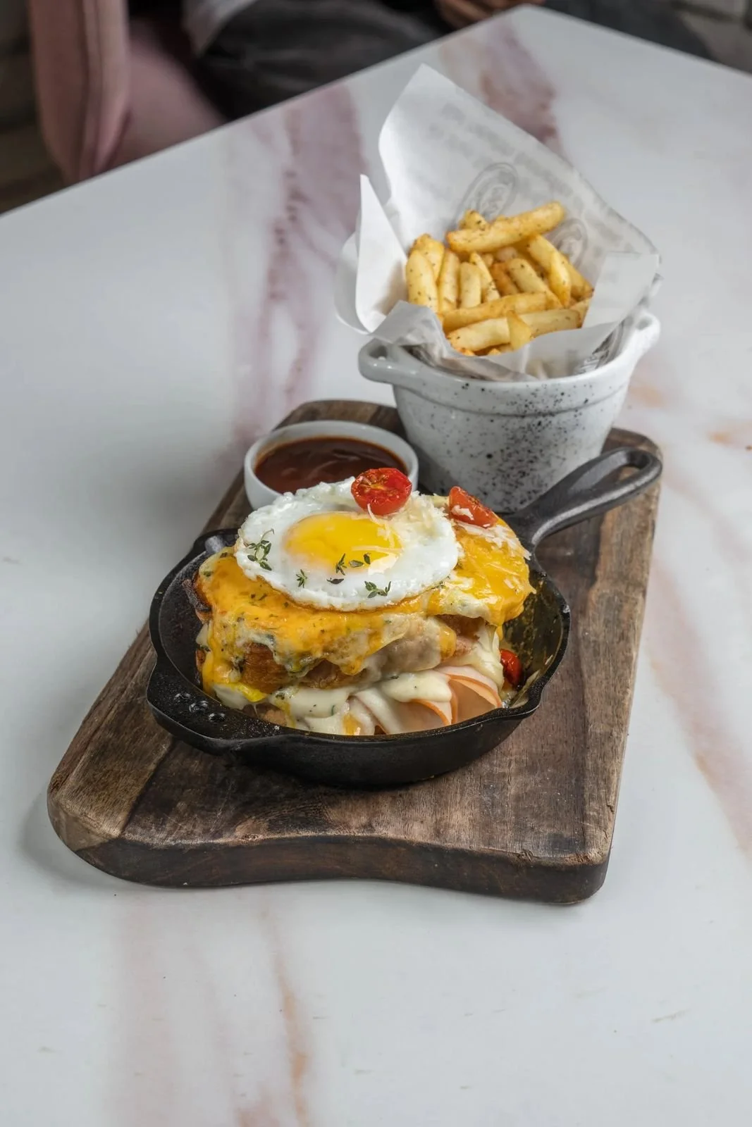Toasted sour dough, smoked turkey, mustard, emmental, cheddar & parmesan Cheese, buttery bechamel sauce & fried eggs, served with fries.
