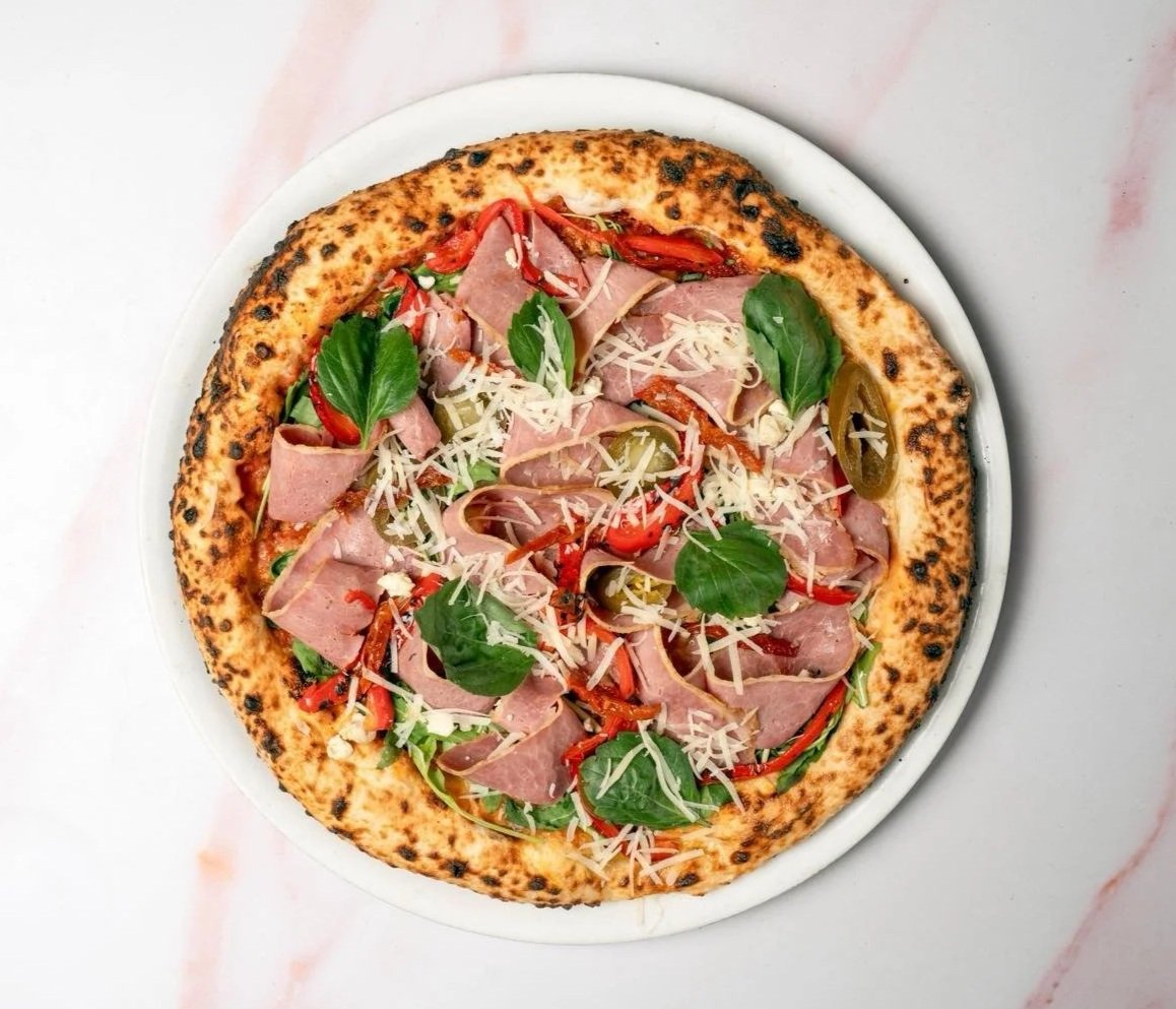 Romesco sauce base and buffalo cheese, smoked beef bacon, jalapenos, rocca, blue cheese with parmesan and fresh basil.